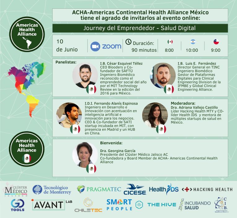 10 de junio, 2021 08:00 MEX | 10:00 ARG | 09:00 Chile | 15:00 Spain ACHA-Americas Continental Health Alliance MEXICO tiene el agrado de invitarlos al evento online:Journey del Emprendedor – Salud Digital Los invitamos a #registrarse al